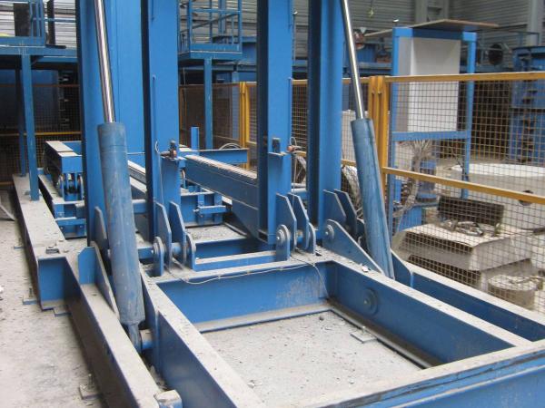 Nach der Aushärtung des Betons wird die Schalungspalette mit dem fertigen Wand- oder Fassadenelement mittels hydraulischer Schwerlastarme in die senkrechte Position gekippt. Dies ermöglicht eine sichere Entnahme des Bauteils zur weiteren Verarbeitung, Lagerung oder zum Versand.