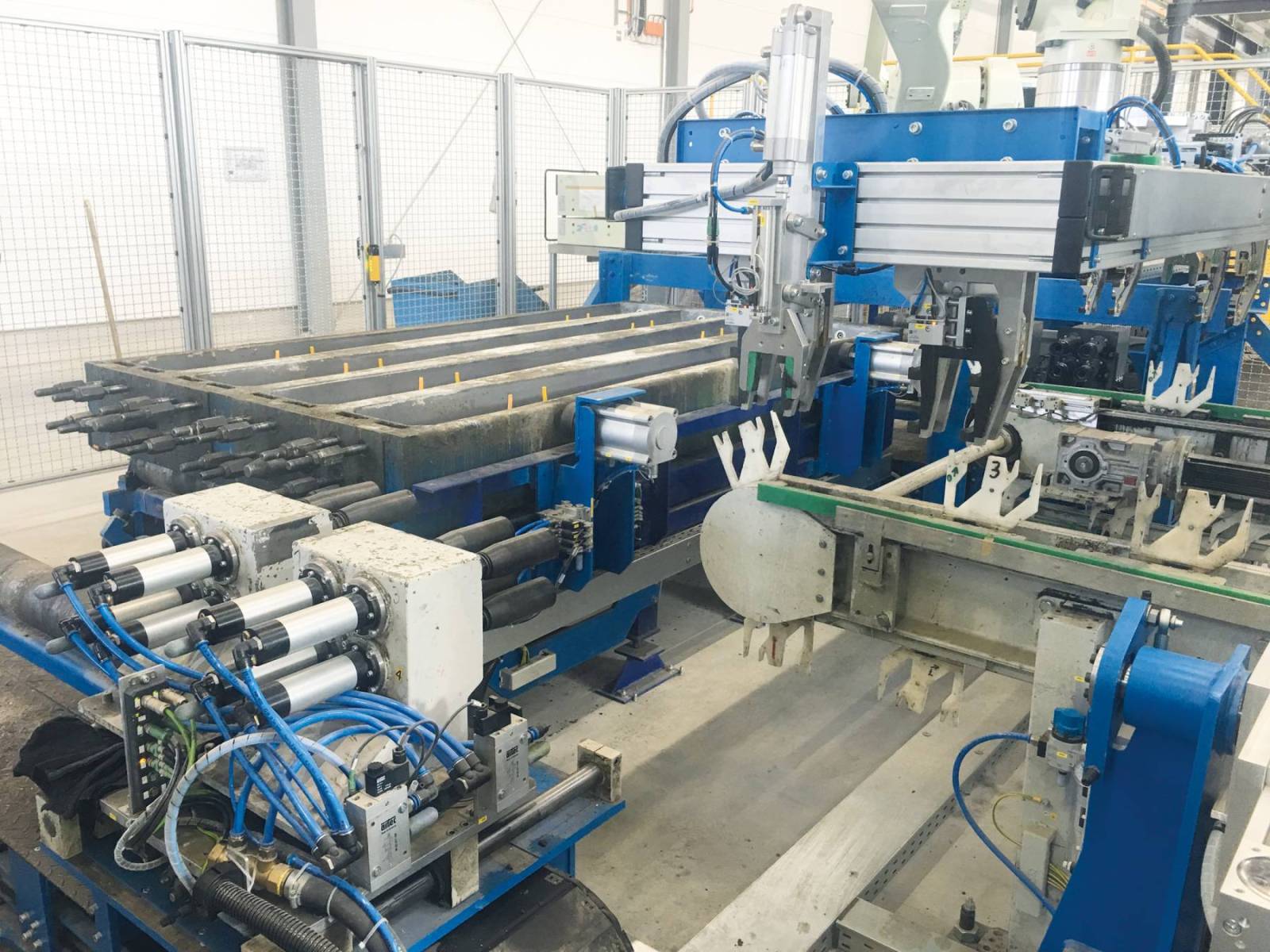 Das Herzstück der Umlauffertigung ist ein modulares Transportsystem, bei dem die Paletten sequenziell von Bearbeitungsstation zu Bearbeitungsstation geführt werden – vom Reinigen und Plotten über Bewehrung, Betonieren und Glätten bis hin zur Aushärtung und Entschalung.