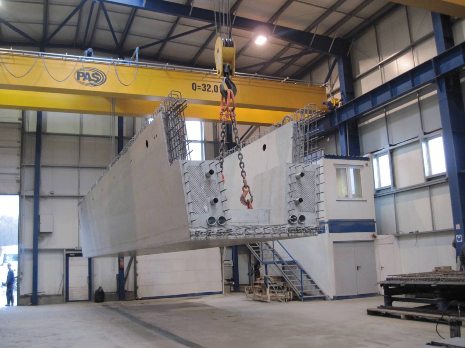 The total stressing force of 1000T is divided over both the bed and the sides. The top of the sides can accommodate a frame onto which 2 modular open core forms can be suspended. These frames resist to the lateral forces applied on the side-forms by the fresh concrete and prevent the buckling of the bed.
