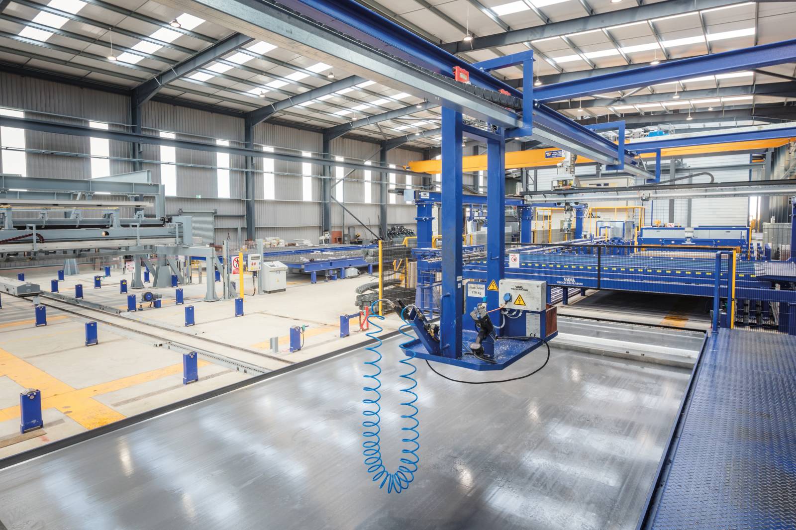 El material de encofrado, los imanes y otros componentes se almacenan en un sistema de estanterías ubicado a lo largo de la bandeja, con una plataforma de trabajo integrada a la misma altura que la bandeja.