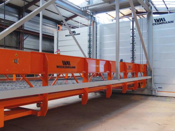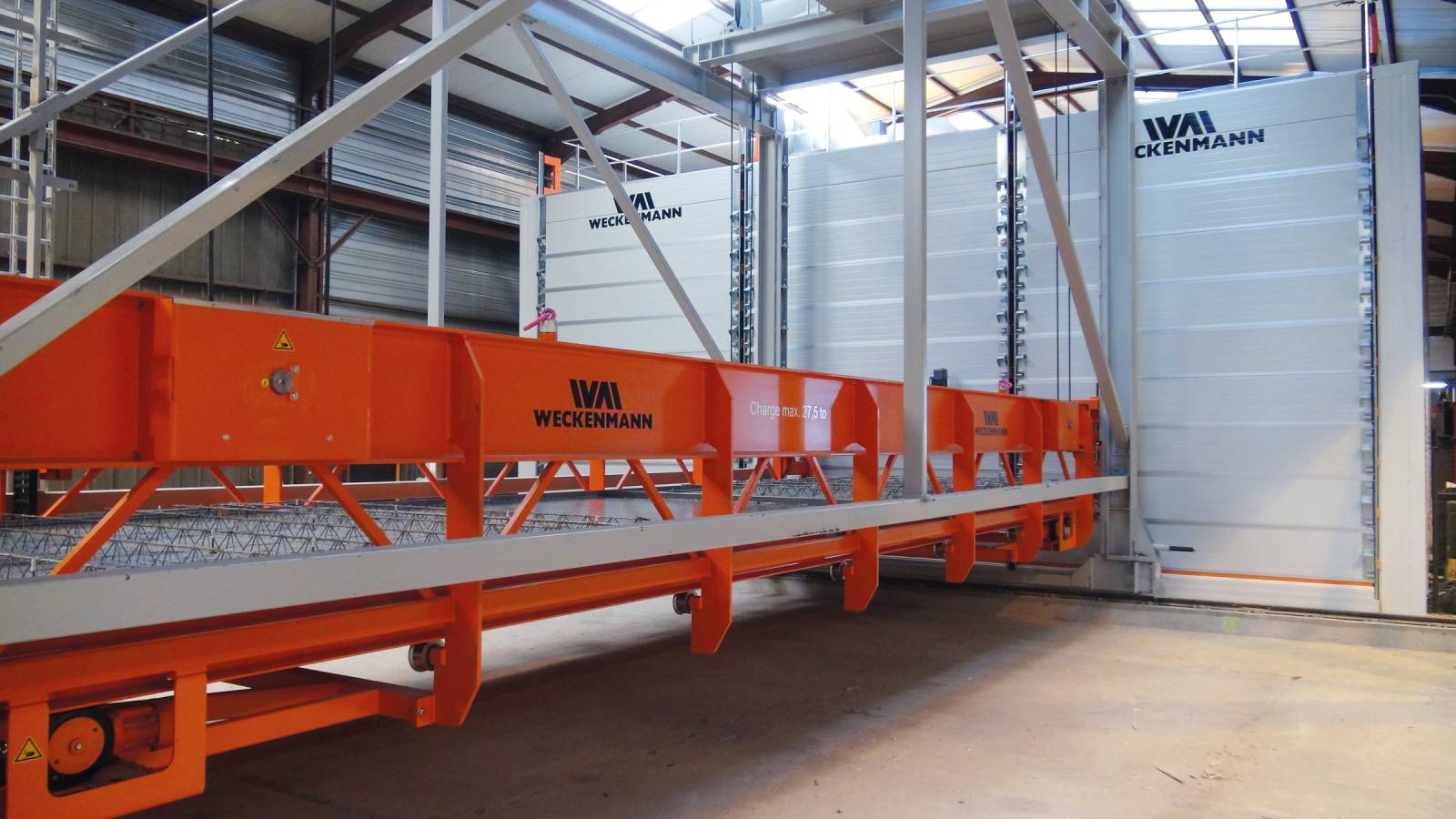 Los sistemas de almacenamiento y recuperación, conocidos como transelevador u operadores de estanterías, almacenan automáticamente las bandejas en la cámara de curado y las recuperan una vez finalizado el proceso de curado.