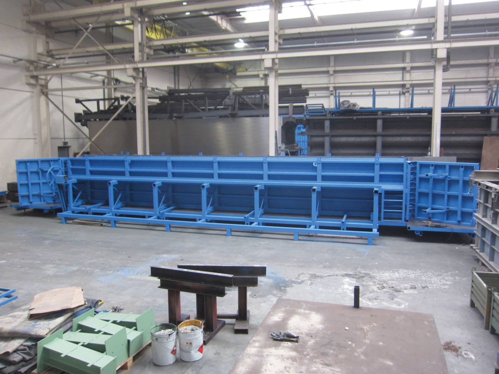 Se trata de un molde de escalera completamente equipado, que incluye paneles de descansillo ajustables, y fondos para descansillos. El molde cuenta con un panel central fijo y dos paneles exteriores móviles, los tres equipados con plataformas de trabajo. Para facilitar el acceso al panel central fijo, se han instalado escaleras de acceso en ambos extremos, las cuales pueden retirarse fácilmente si interfieren en la producción de un tramo con descansillo inferior.