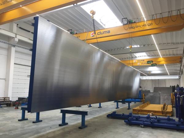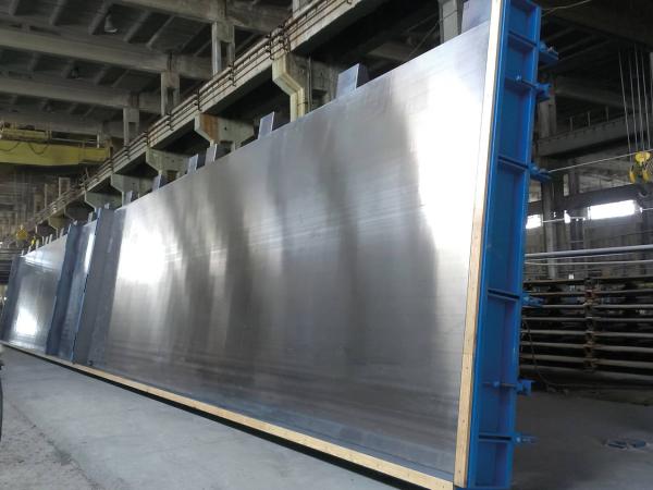 Les revêtements en acier peuvent avoir une taille maximale de 16m x 4,5m en 1 morceau, sans joints dans les plaques. Ces plaques sont spécialement roulées pour les surfaces de coffrage, sablées à l’avance et après assemblage, dans nos ateliers, polies sur notre ponceuse automatique.