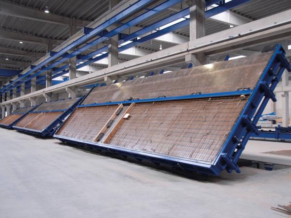 Le degré de lissage est conforme aux exigences du client. Plus grandes dimensions sont également possibles. Dans ces cas la table est fabriquée en plusieurs pièces. Après installation les jonctions entre les pièces sont soudées et poncées lisses. Pour avoir un démoulage facile, rapide et sans casses, il faut incliner les éléments préfabriqués avant de les enlever. Ainsi ils peuvent être retirés et rangés verticalement. L’utilisation d’une table hydrauliquement inclinable est désignée.