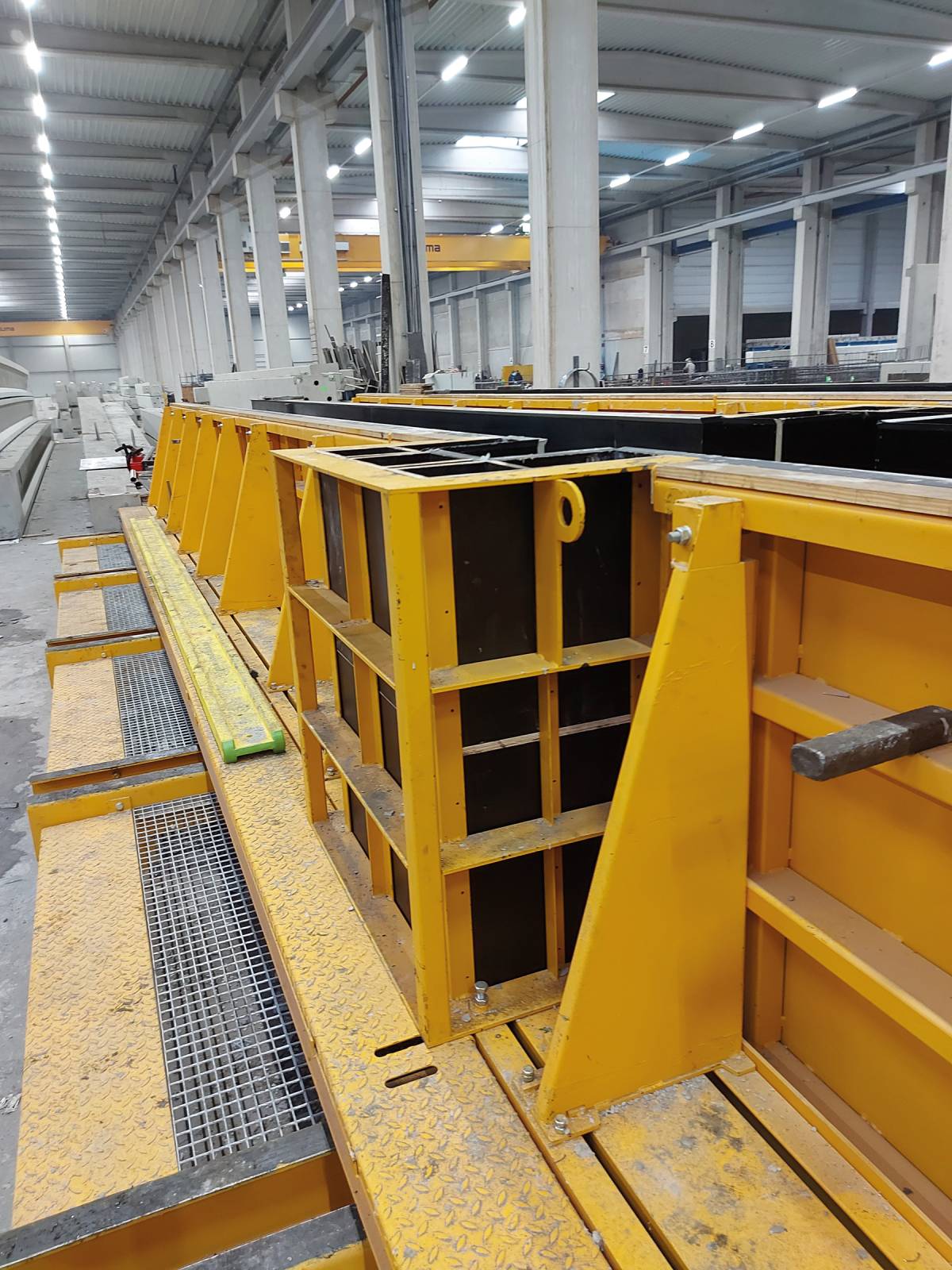 Pour la production de colonnes avec plusieurs consoles, Construx-Weckenmann a équipé ses moules Bibat bi-poches standard de panneaux latéraux modulaires. Les panneaux latéraux, en acier plein, sont divisés en différentes parties et montés sur des roulettes pour un déplacement latéral.